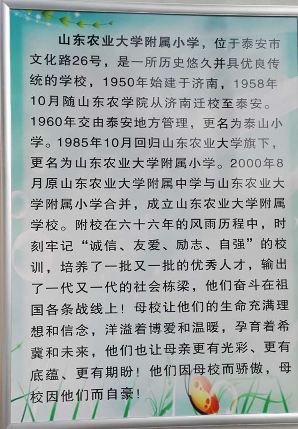 农大附校是一座历史悠久并具有优良传统的学校,1950年在济南建校,于1958年10月随山东农学院从济南迁至泰安。附校在66年的峥嵘岁月中,时刻牢记“诚信、友爱、励志、自强”的校训,培养出了一批又一批的优秀人才,输出了一代又一代的社会栋梁,他们奋斗在祖国各条战线上,母校让他们生命充满了理想和信念,洋溢着博爱和温暖,孕育着希冀和未来。他们也让母亲更有光彩、更有底蕴、更有期盼!他们因母校而骄傲,母校因他们而自豪!