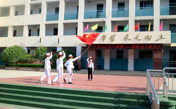 入队仪式在雄壮有力的出旗曲中拉开序幕,少先队员敬队礼向队旗致敬,接着一年级的新队员上场,由老队员给新队员系上了鲜艳的红领巾。在队旗下,新队员高举右手,一起跟着大队长庄严宣誓。新队员代表牛妙硕发表了入队感言,表达了入队后的喜悦心情,也表示以后将更加勤奋学习、勇于进取,争做优秀少先队员。入队仪式同时为新建的两个中队授了中队旗。最后,全体少先队员们在大队辅导员梁老师的带领下大声呼号:“时刻准备着”,表明为共产主义事业贡献力量的决心。伴随着庄重的退旗曲,本次入队仪式圆满结束。