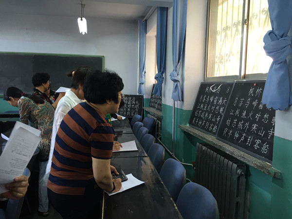 比赛采用现场小黑板书写的形式,板书内容统一,选的是张继的《枫桥夜泊》,时间是半小时。比赛进行完毕后,经评委组打分,评选出一等奖三名,二等奖八名。