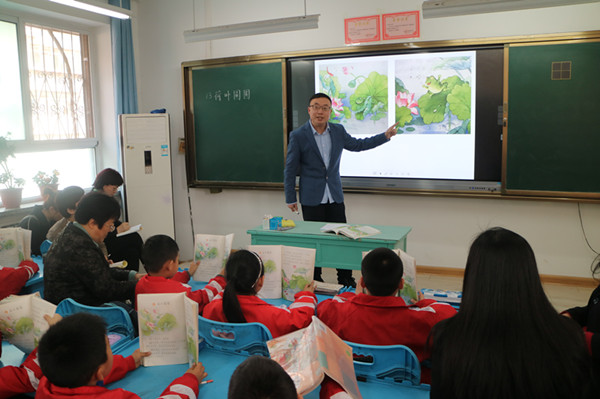 本次视导工作分坐谈、讲课和评课三个环节。首先刘旭与附校的骨干老师进行了坐谈,了解附属学校教师课备授课情况,学生读书习惯养成情况,作业检查情况,教后反馈情况等几个环节的问题,并提出了“聚焦课堂,审读课堂,研究课堂,立意课堂,反思课堂,创新课堂”的指导思想。其次是由南实小的马伟老师为我们上了一节一年级的语文课——《荷叶圆圆》。马老师从学生兴趣出发,结合学生在读课文过程中遇到的字词障碍,引导学生运用多种方法识记生字,利用多媒体优美的图片阐述字词含义。课件容量大,富有直观性,很适合低年段的学生。在朗读教学上,他有要求、有提示、有提高,努力让学生理解句子表达的感情,读出来的课文非常有韵味。最后评课环节,老师们纷纷表示,马伟老师从回顾旧知识入手,温故而知新让人印象深刻;训练学生说完整的句子,对学生的评价语言切合学生的实际,很走心。