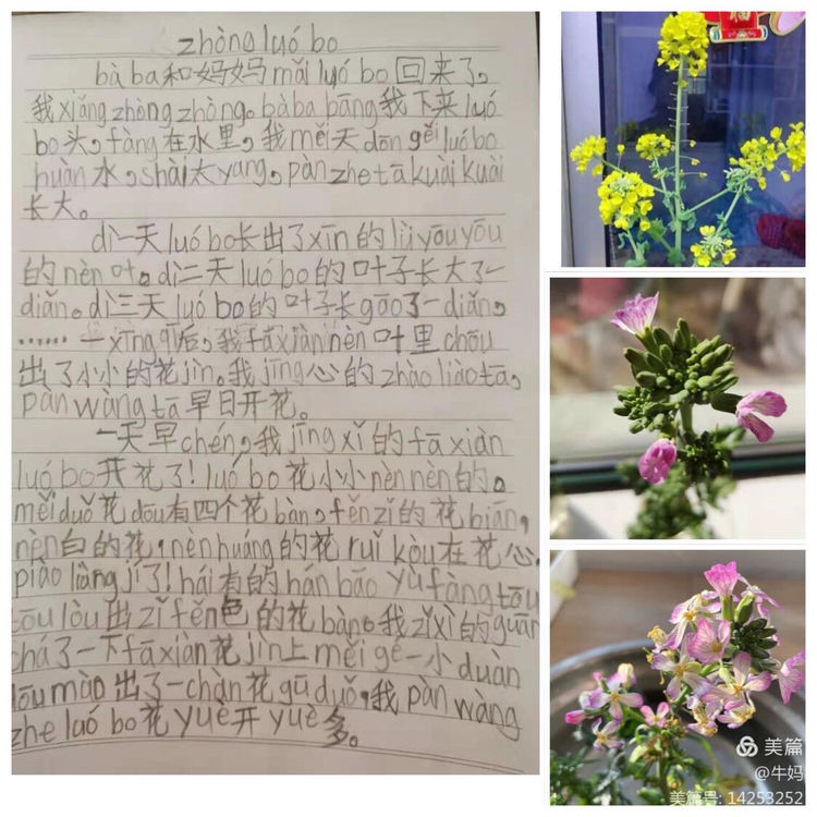 放假前, 蔺老师布置了一项奇特的作业,让我们水培白菜和萝卜!刘若鑫的白菜花金灿灿的,牛泓樾的萝卜开出一串别致的紫花。王尚玺同学种的是一株萝卜,它居然开出了美丽的小花,为单调的冬天增添了一抹色彩。小主人仔细观察,大笔一挥,哈哈!一篇习作诞生了!