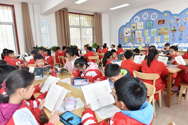 教育开展以来,附校持续加强对少年儿童的“四史”教育,建设“阳光书屋”就是其中的重要工作举措之一。在这个温馨明亮的书屋内,记者注意到,现场存放的2000册图书中,大部分都是红色故事、科学百科、文学著作等经典读物。刘焕芬对记者说,阅读在教书育人中有春风化雨的重要作用,有时候一个故事、一段文字,往往就能触动孩子幼小的心灵,让爱党爱国爱人民的种子在他们心间生根发芽。