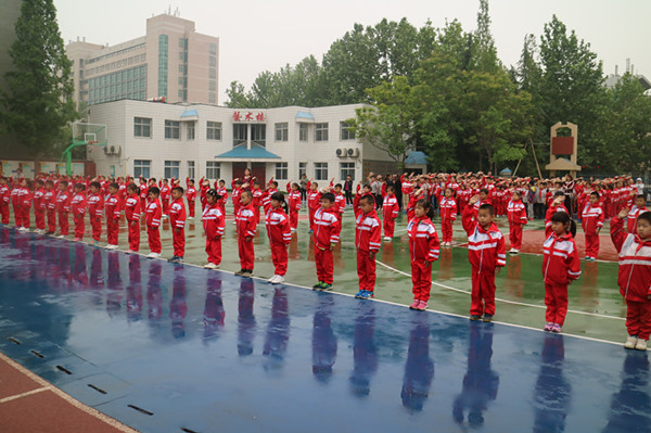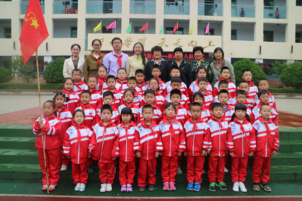 5月11日清晨,农大附校举行了“红领巾召唤我前进”新队员入队仪式。在国旗台前,迎着朝阳,沐浴着春风,伴随着中国少年先锋队队歌,队员们请出了神圣的队旗。76名学生在老师和老队员的见证下,由优秀的少先队员代表为他们佩戴上了革命烈士用鲜血染成的红领巾,并授予新中队中队旗。
